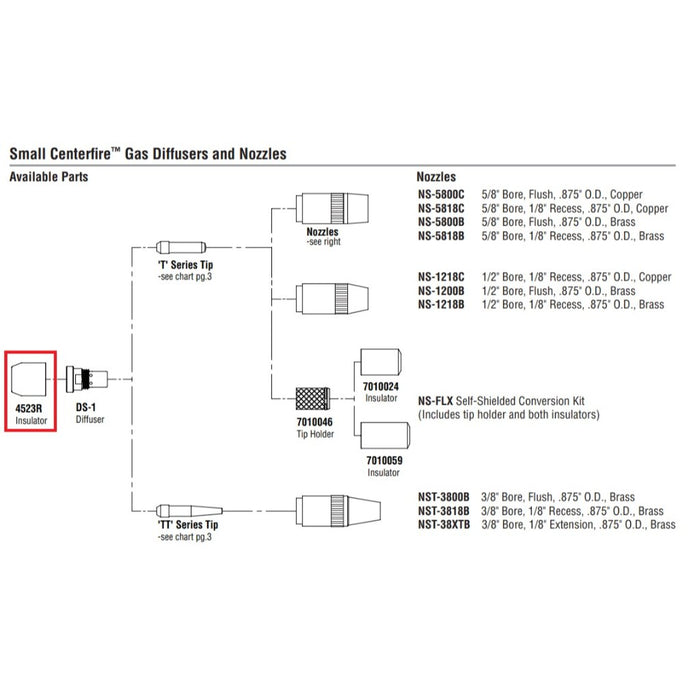 Bernard style insulator cap for Bernard MIG guns using small centerfire consumables and DS-1 diffuser. Bernard part number 4523. See parts diagram for further explanation.