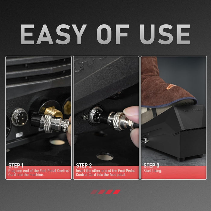 The YesWelder Foot Pedal is designed to provide amperage control for compatible TIG welding machines equipped with 5-pin torch controls. Just step to activate the gas contactor and increase amperage; release to turn off and decrease amperage.